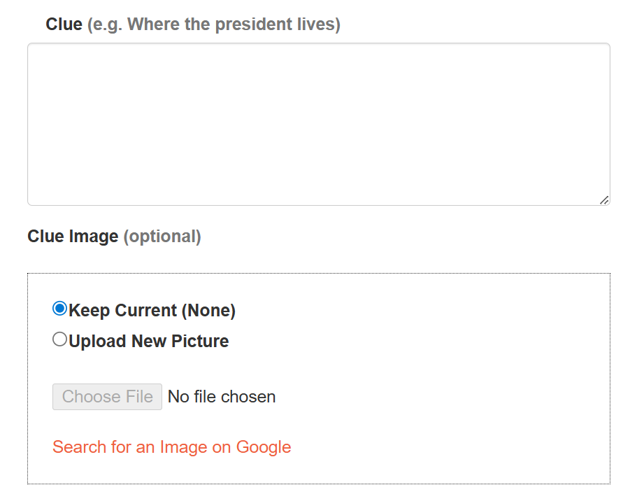 - Clue Image - As the saying goes, a picture is worth a thousand words. Sometimes it is helpful to include an image, and sometimes it's better to only have an image as the clue.